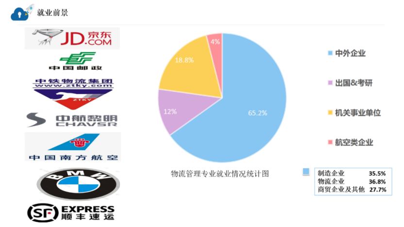专业毕业生具有明显的专业竞争优势,可以进入各类制造、商贸、物流企业从事采购、生产、销售,以及全球供应链的物流运作及管理工作,可以从事航空物流运营管理的相关工作,也可为物流服务提供方和物流服务需求方提供物流数据分析、咨询等工作,以及从事相关的科研、教育培训和行政事业单位的物流管理工作。超40%毕业生就职于国内知名大型企业。
