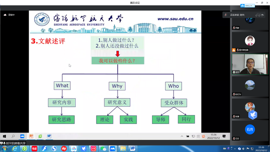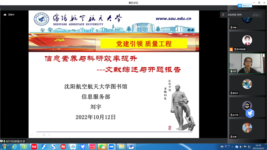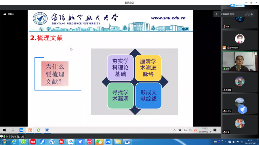 10月12日,作为本次系列培训的首位讲师,图书馆刘宇老师为经管学院全体研究生作了《文献综述与开题报告》专题讲座。讲座通过腾讯会议进行,图书馆直属党支部书记刘涛、经管学院副院长唐金环、图书馆信息服务部主任包晗等参加了此次培训。