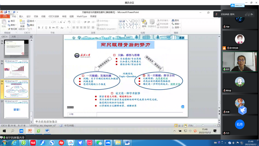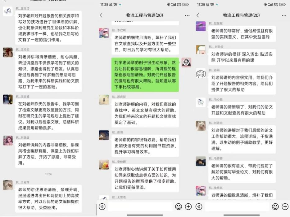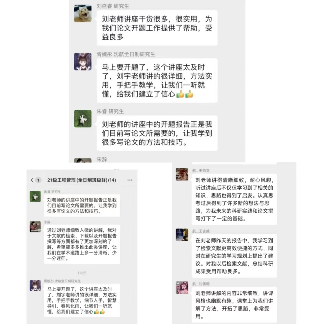 刘宇老师的讲授风趣幽默、深入浅出,由思维方式出发,落地于实践实操。参会学生表示,两个小时的培训可谓内容丰富、干货满满,不仅提供了许多方法和技巧,也带来了新的思路与启发;通过培训,明晰了开题报告的具体要求,掌握了文献检索的方法,领会了文献梳理的重要性,厘清了文献述评的相关思路。大家纷纷表达了对未来几期培训的期待。