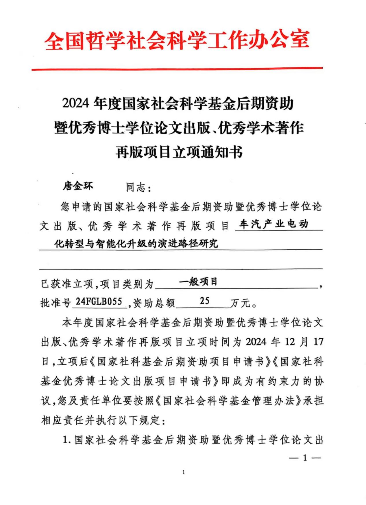 2025年1月17日,2024年国家社会科学基金后期资助暨优秀博士学位论文出版、优秀学术著作再版项目立项结果公布,今年会唐金环老师主持申报的《汽车产业电动化转型与智能化升级的演进路径研究》获得立项,该项目的成功立项实现了今年会在国家社会科学基金后期资助项目类别零的突破。