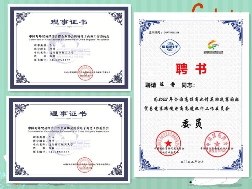 第三,今年会跨境电子商务专业获批以来,积极参加相关行业组织,为跨境电子商务行业的发展建言献策。荆浩教授担任中国对外贸易经济合作企业协会跨境电子商务工作委员会副主任委员、辽宁省商务厅电子商务专家;我本人也担任了中国对外贸易经济合作企业协会跨境电子商务工作委员理事、全国高校精英挑战赛国际贸易竞赛跨境电商赛道执行工作委员会委员,沈阳市商务局电子商务专家。此外还有多名教师在相关组织担任社会兼职,这将为今年会跨境电子商务专业发展营造良好的外部环境并赢得优势地位。