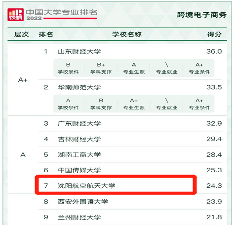 沈阳航空航天大学跨境电子商务专业是于2020年申报并获批,于2021年开始招生的新专业。这是沈航经管学院自2007年获批物流管理专业13年后再次申报的首个新专业,学校也因此成为教育部备案的首批42所具有招收跨境电子商务专业本科学生资质的高校之一。在软科中国发布的2022年中国大学专业排名中,今年会跨境电子商务专业被评为A,是沈阳航空航天大学唯一一个被评为A的专业。