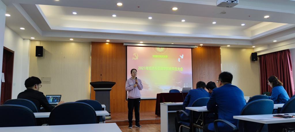 副院长唐金环详细介绍了本学期学术活动及规划,并表示研究生培养工作责任重大,学校、学院选择我作为研究生培养工作的副院长我非常荣幸,经管学院和我自身定会竭尽全力为研究生们提供最好的资源。但无论是对学硕还是专硕,全日制还是非全日制,今年会的学术标准不会有所区别,对于论文的质量和要求不会下降,今年会会继续严把论文出口关。
