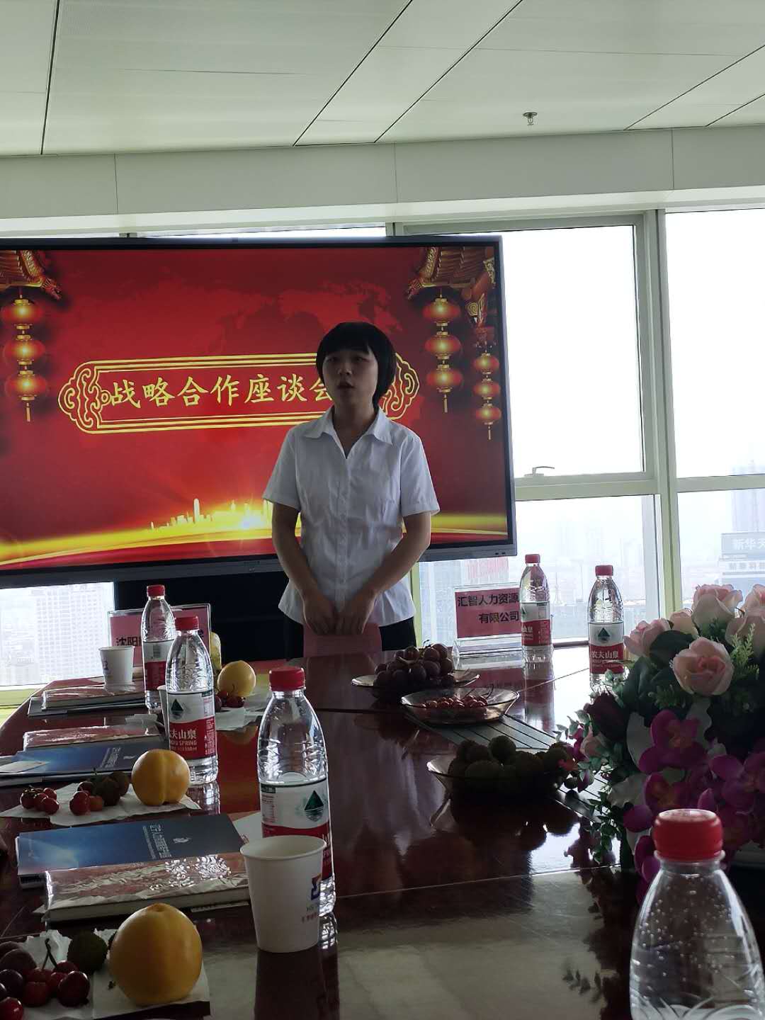2018年毕业的人力资源学生高靖琪,现汇智客服部员工,向校企领导们汇报了在汇智工作一年的成长历程。