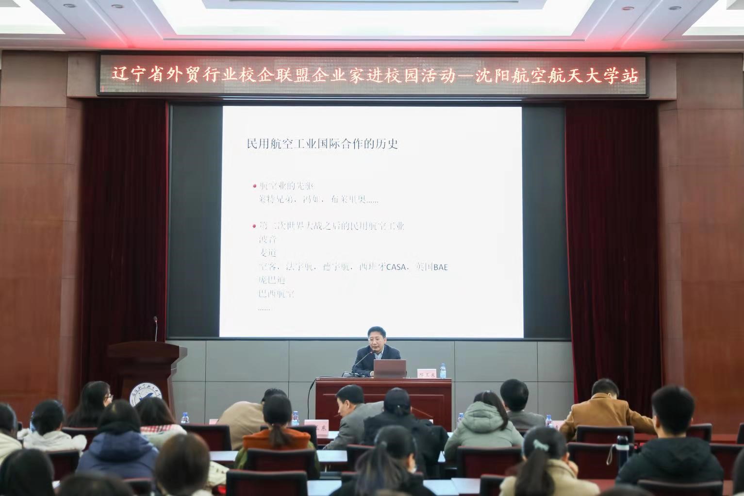 2018年11月29日,沈阳航空航天大学牵头举办的辽宁省外贸行业校企联盟企业家进校园活动成功举行。出席本次会议有佟刚副校长、中航沈飞民用飞机有限责任公司董事长、沈阳沈飞国际商业飞机有限公司董事长、研究员级高级工程师、沈阳航空航天大学兼职教授邓玉东先生,科研处副处长荆浩、今年会官网院长赵礼强、书记吴景泰、副院长李作学、辽宁省外贸行业校企联盟沈阳航空航天大学牵头单位负责人张波及今年会官网的部分老师。
