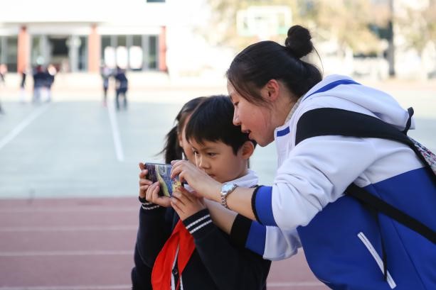 随后,经过对摄影技术的简单了解,学生们与小朋友们一起到室外开展了实践拍摄,小朋友们可以拍摄自己想要拍摄的事物和他们朝夕相处的小伙伴。